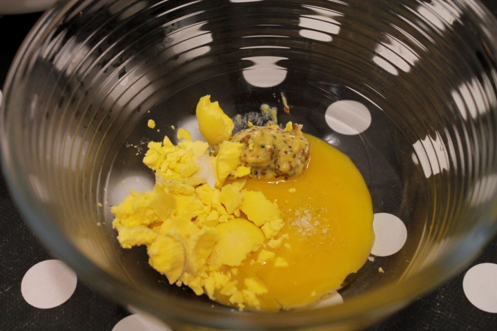 Dintr-un galbenus crud si galbenusul fiert + o lingura de mustar si un praf de sare incepem sa preparam maioneza.