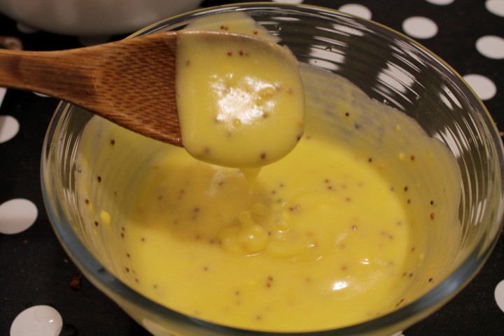 Se paseaza cu o lingura de lemn galbenusul tare si se amesteca pana se omogenizeaza cu cel crud pana devin ca o crema. Se adauga apoi ulei in fir amestecandu-se in acelasi sens, din cand in cand mai adaugati si putina zeama de lamaie si gustati maioneza, aceasta trebuie sa fie usor acrisoara nu ca la salata de boeuf.