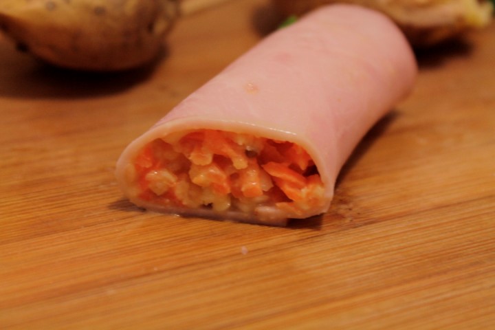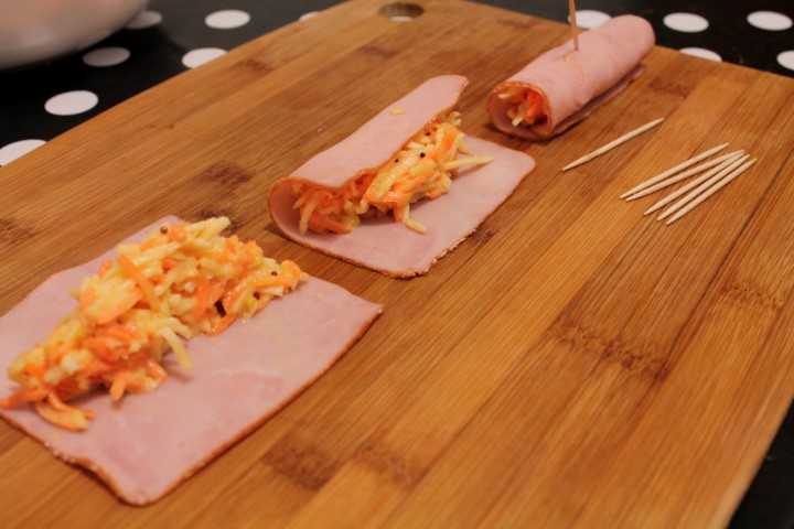 Dupa ce salata este gata incepem sa formam rulouri din sunca umplute asa cum este prezentat in poza. Se fixeaza cu scobitori si este gata.