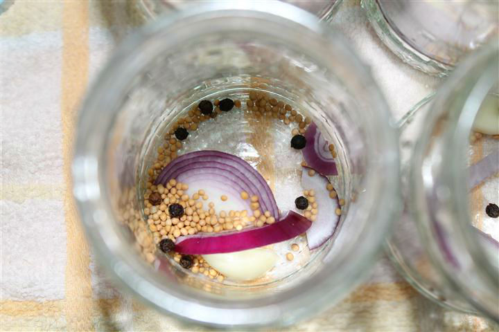 In borcanele sterilizate se pune 1 catel de usturoi, o feliuta de ceapa (julien), 1 lingurita boabe de mustar, 6-7 boabe de piper.