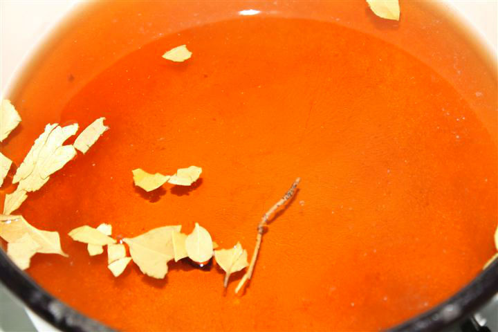 Intr-o oala se pune la fiert otetul impreuna cu sarea, zaharul, foile de dafin, apa si otetul balsamic. Se tine pe foc pana incepe sa clocoteasca.