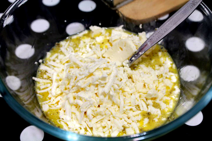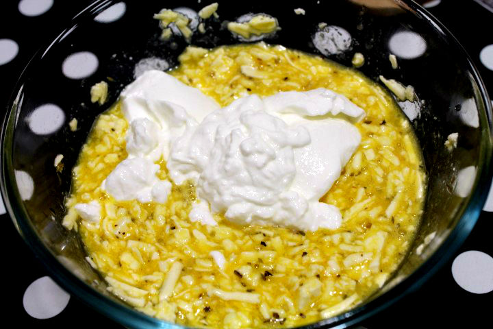 Se adauga branza data pe razatoarea mare si smantana si se omogenizeaza bine.