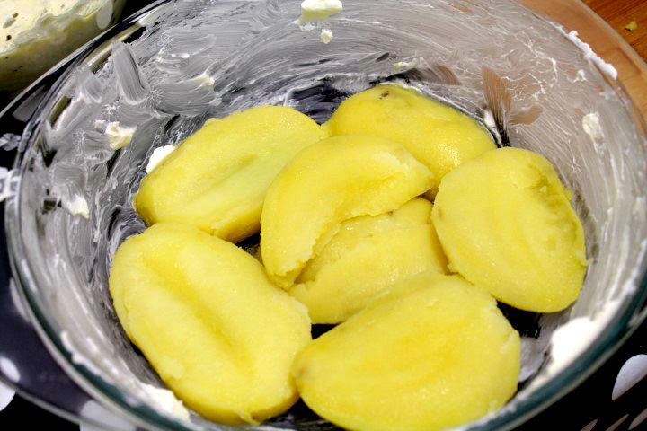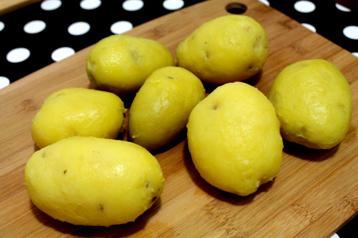 Cartofii in coaja se pun la fiert in apa cu sare, se fierb mai tari, incercati cu degentul sa nu fie asa moi ca pentru piure. Dupa ce s-au fiert, cartofii se curatat de coaja si se lasa la racit.
