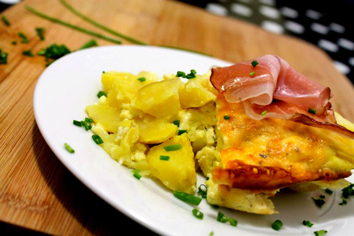 Va prezint cartofi frantuzesti varianta mea: am scos oualele fierte din ecuatie, am adaugat putina sunca cruda (eu folosesc de la LIDL, Sunca din padurea neagra), putin tarhon, putin coriandru, niste boabe de piper si cascavalul afumat, puternic afumat de tara :). M-am gandit sa pun felii de sunca si printre randurile de cartofi, insa trebuie sa recunosc ca am uita :(, de asemenea cand serviti sunca poate sa fie asa cruda, sau prajita putin in tigaie, cred ca merge mai bine prajita putin.
