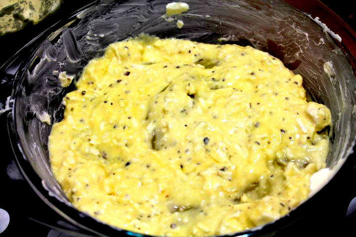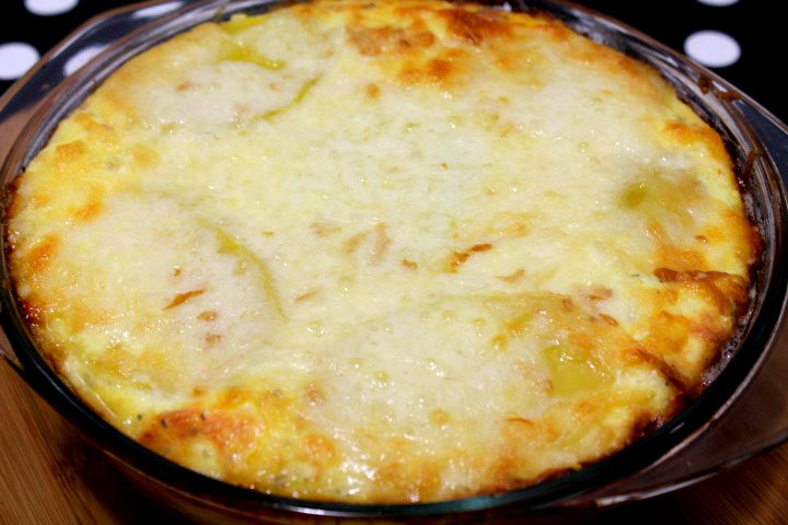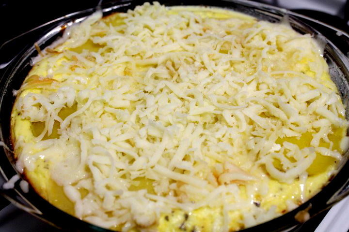 Se ia un vas de yena/ceramica si se unge bine peste tot cu unt. Se pune un rand de felii de cartofi, groase cam de 1 deget apoi se pune amestecul de oua cu branza, apoi iar cartofi iar oua cu branza si la final un rand de cartofi.