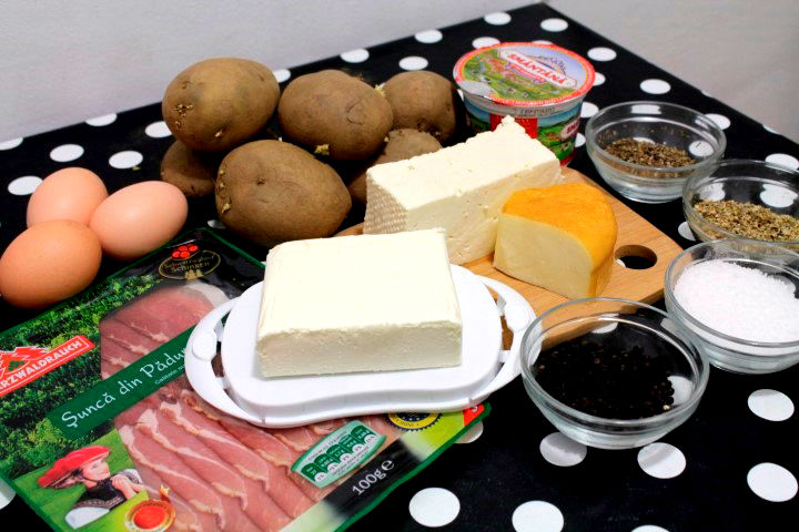 Se da la cuptorul incalzit la 180 de grade pentru 35 de minute, cu 10 minute inainte se scot se pe deasupra se pune cascavalul afumat dat pe razatoarea mare si se baga iar la cuptor.