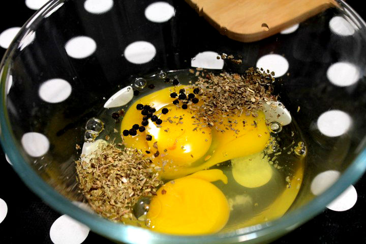 Intre timp intr-un bol se pune oualele cu o lingurita de coriandru, o lingurita de tarhon si 10-15 boabe de piper si se bat bine.