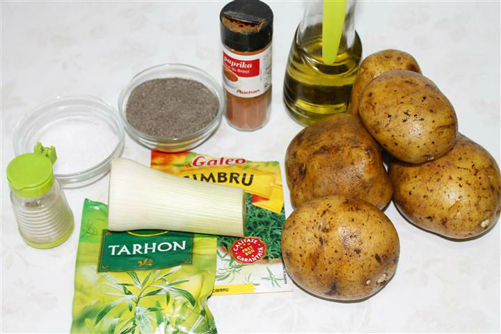 Cartofii de spala bine si se curata de coaja. Se taie in felii mai groase, aproape de 3-4 ori mai mari decat cei pentru prajit. Intr-un bol se pun cartofi si se adauga tarhonul, cimbrul, rozmarinul, sarea, piperul, boiaua, uleiul.