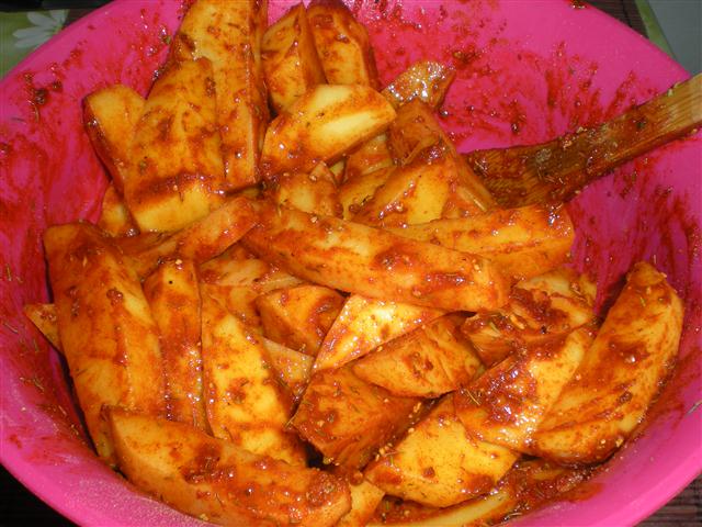 Rozmarinu-ul este ideal pentru cartofi, eu in loc de usturoi utilizez praf de usturoi cu piper de la Fuchs. Sunt multe retete de cartofi wedges la cuptor, problema la gatit cartofi sunt chiar cartofii. Nu prea se mai gasesc cartofi gustosi care sa se coaca/prajeasca bine 🙁
