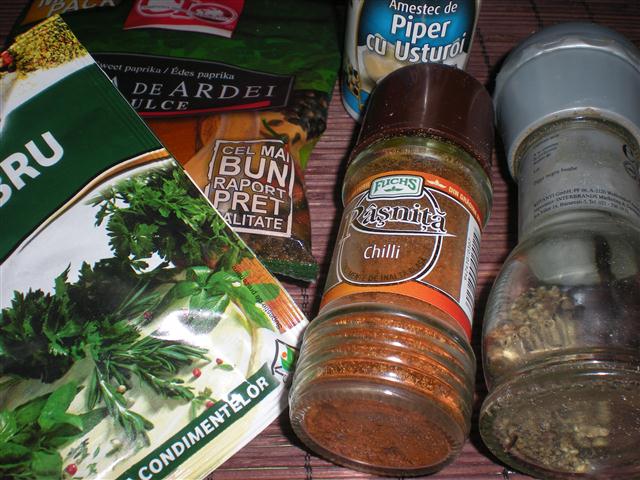 Condimentati cartofii cu piper, usturoi macinat, boia si chilli pentru cei carora le place mai picant. Cimbrul este optional