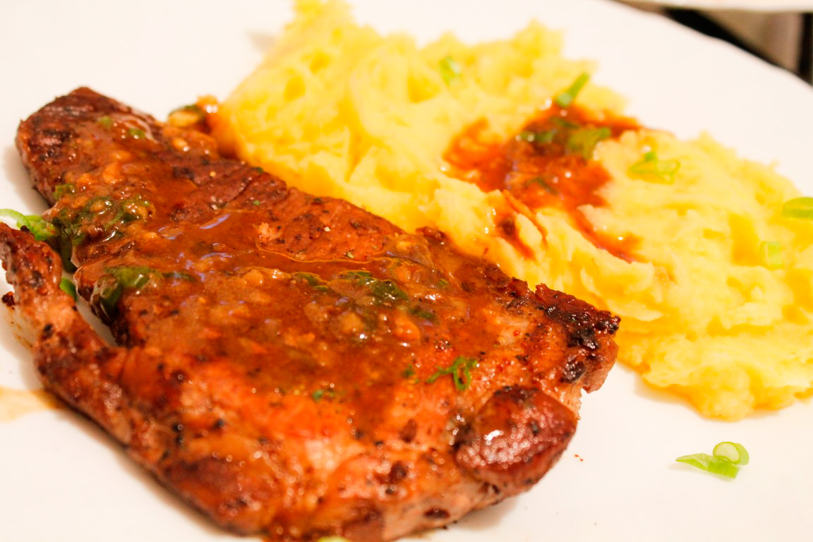 IV. Carnea de porc preparata la tigaie poate fi servita cu o garnitura de piure din cartofi cu morcovi, un sos de ceapa, o salata de ceapa rosie, un piure de mazare etc.