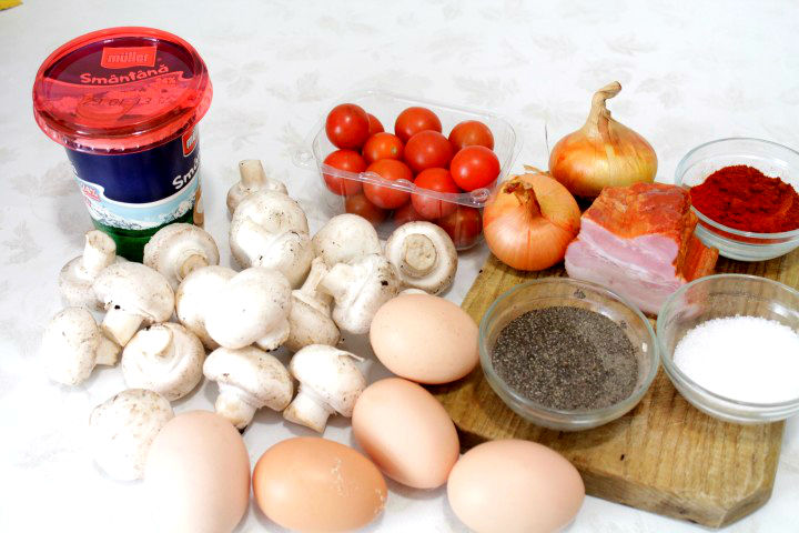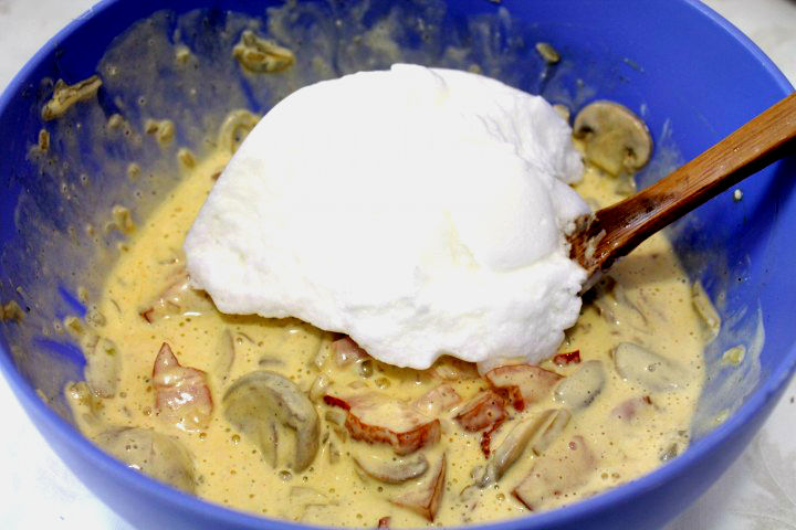 Intr-un bol se amesteca galbenusurile, cu 5 linguri de smantana, baconul, ciupercile si ceapa si se amesteca usor sa se omogenizeze.