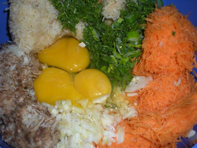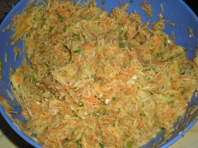 Dati pe razatoare toate ingredintele pentru chiftelute mai putin ceapa. Stoarceti fiecare leguma foarte bine de zeama. Puneti legumele intr-un bol mare. Tocati ceapa marunt.