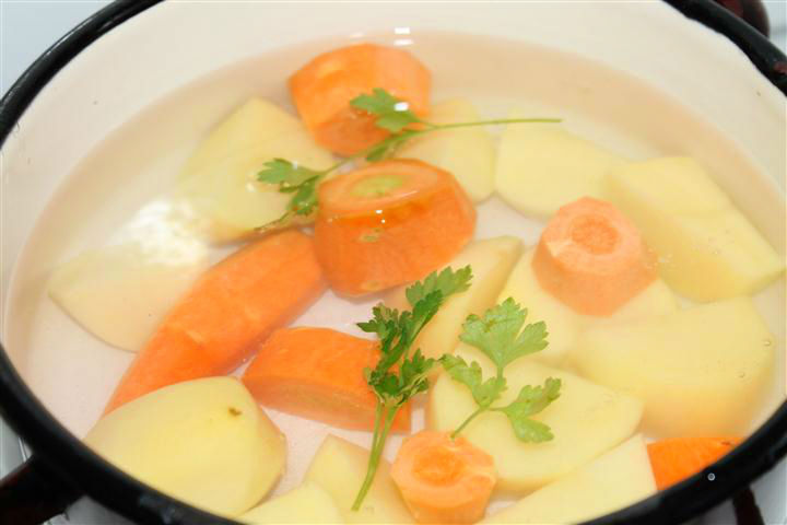 II. Intr-o alta oala se pune la fiert in apa cu 1 lingurita de sare cartofii si morcovii curatati si taiati cubulete mai mari. Se tin la fiert pana devin moi, aproape ca de piure, apoi se scot si se lasa la scurs si racit.