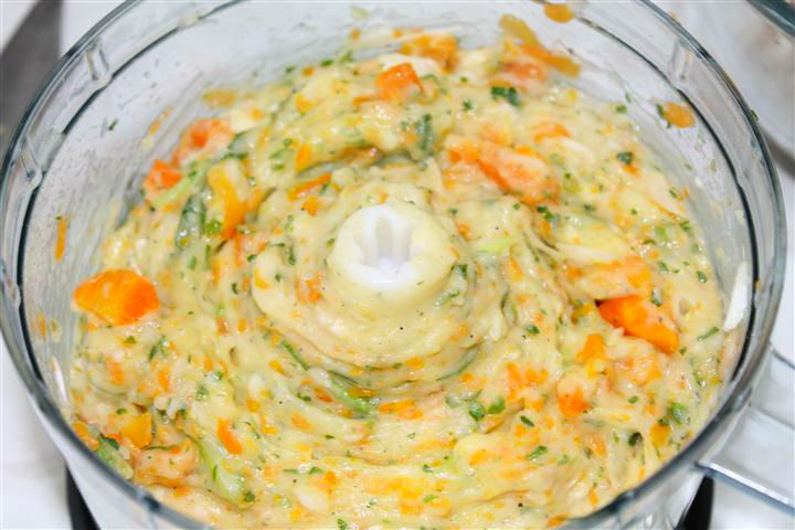 IV. In robotul de bucatarie puneti ceapa, patrunjelul, usturoiul, morcovii si cartofii fiert si mixat la viteza mica pana cand acestea devin aproape ca o pasta.