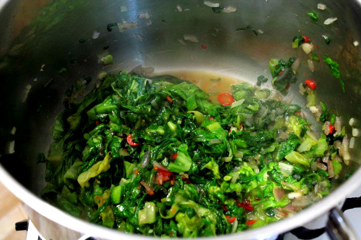 Condimentati cu o lingurita de sare si o lingurita boabe de piper. Dupa aprox 1 minut se pune si salata verde, tocata cam de 1-2 degete ca si grosime.