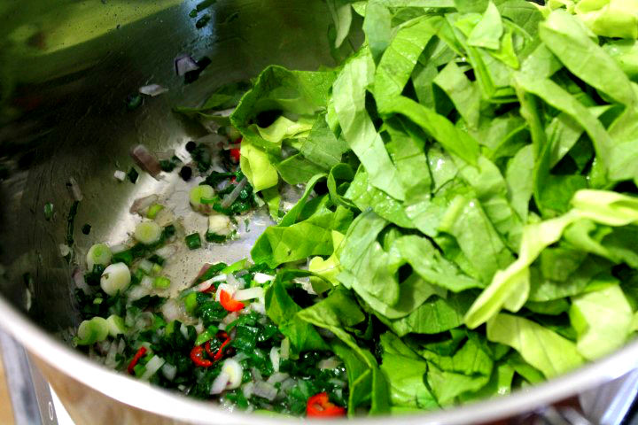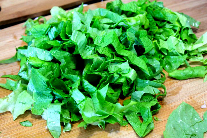 Ceapa verde si mararul se spala si se pun la scurs alaturi de salata pe un prosp de bucatarie. Se toaca marunt ceapa rosie, ardeiul iute si ceapa verde si se pun intr-o oala la calit cu putin ulei.