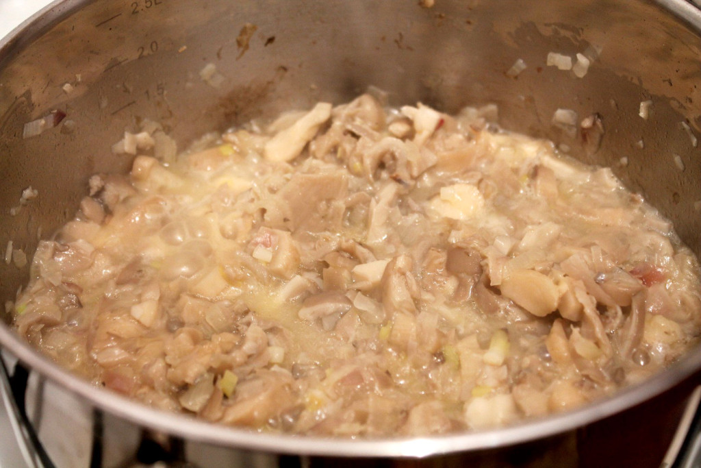 IV. Se adauga apoi ciupercile pleurotus cu tot cu picioruse, spalate bine si tocate mediu. Se amsteca bine si se lasa sa se caleasca si aceastea.