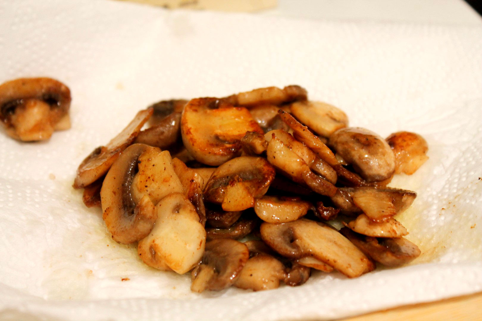 I. Ciupercile champignon se curata de picioruse se spala bine si se taie in felii mai mare. Se pun apoi la calit in ulei de masline si o lingurita de unt.