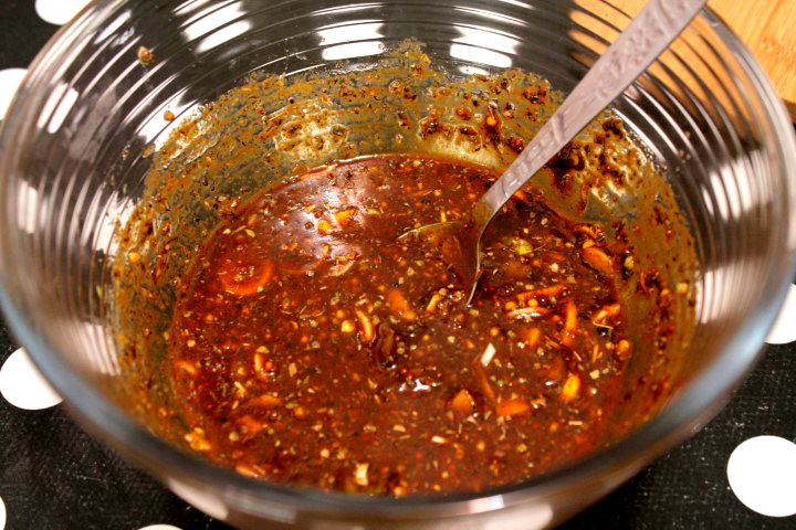 Intr-un bol se pun condimentele cu o singura lingurita de sare, cu usturoiul si ardeiul tocat marunt + sosul de soia.