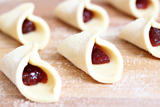 V. Puneti cate o lingurita de gem in mijlocul bucatelei de aluta si apoi adunati doua colturi opuse pe care sa le strangeti usor cu degetul. Nu puneti prea mult gem in cornulete in momentul coacerii acesta o sa iasa in aluat.