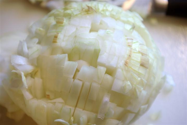 4. Intoarceti ceapa pe o laterala si incepeti sa taiati perpendicular pe taieturile realizate mai devreme.