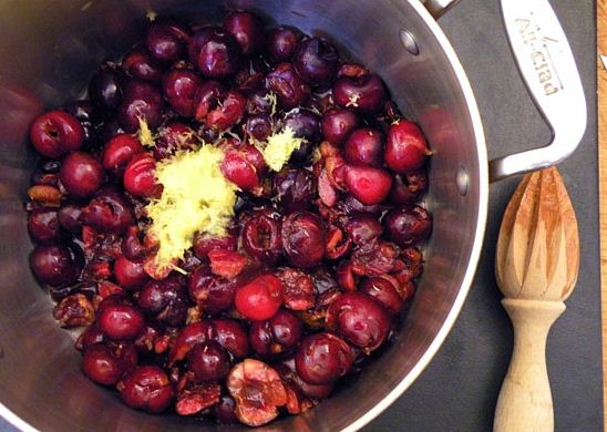 Amestecati visinile si coaja de lamaie cu zeama de lamaie astfel incat aromele sa se amestece foarte bine. Se pune pe aragaz la foc mediu spre mic
