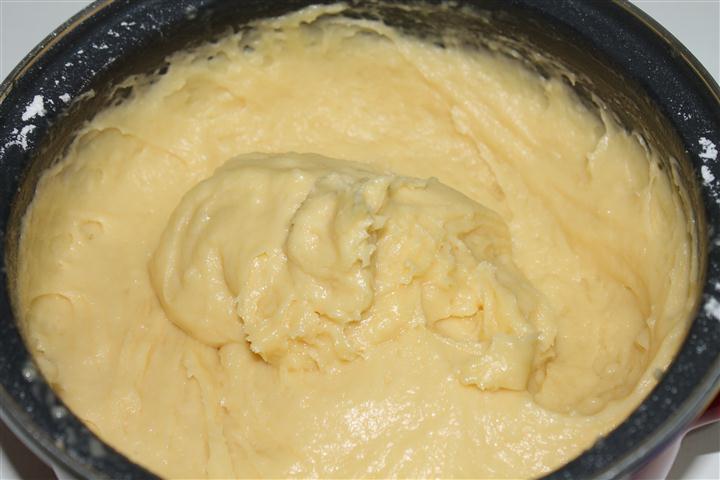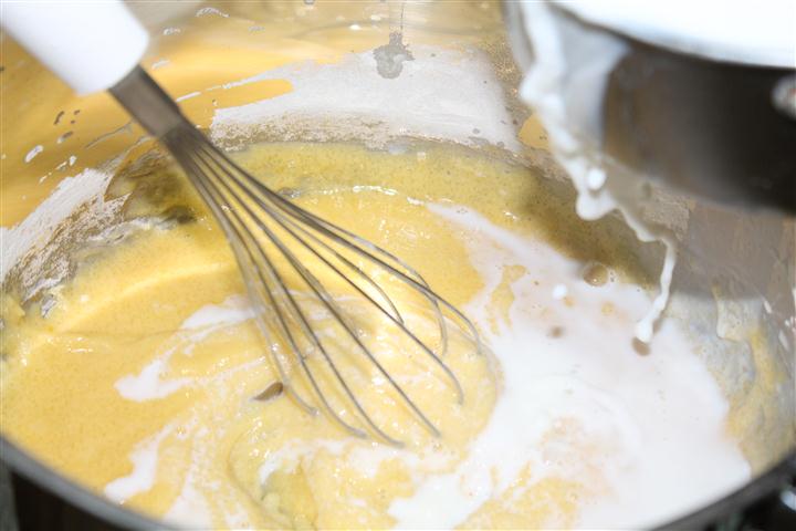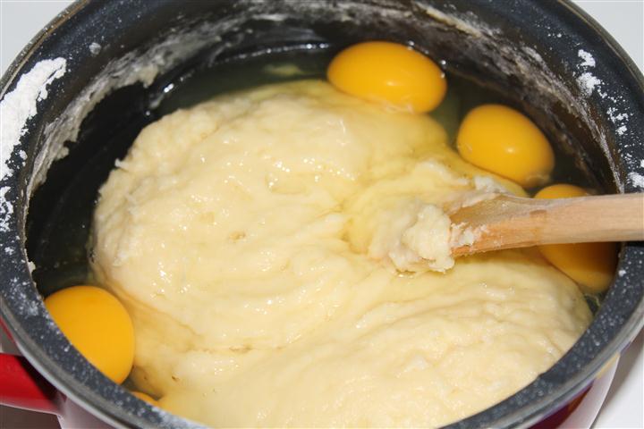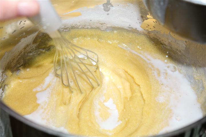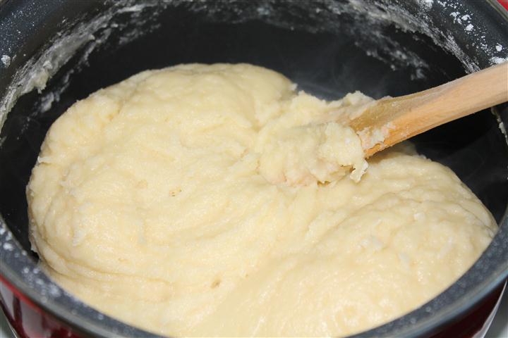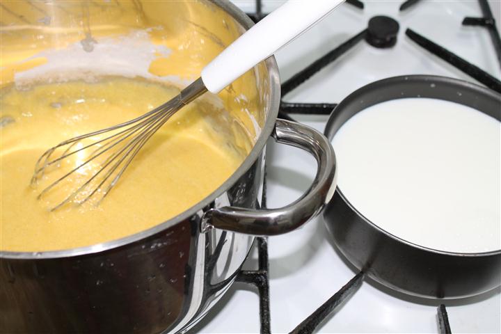 Se pune la incalzit laptele intr-un alt vas pana devinde fierbinte. Oala cu aluatul din oua, zahari si faina se pune pe foc si se adauga treptat laptele fierbinte amestecandu-se cu un tel sa nu faca cocoloase.