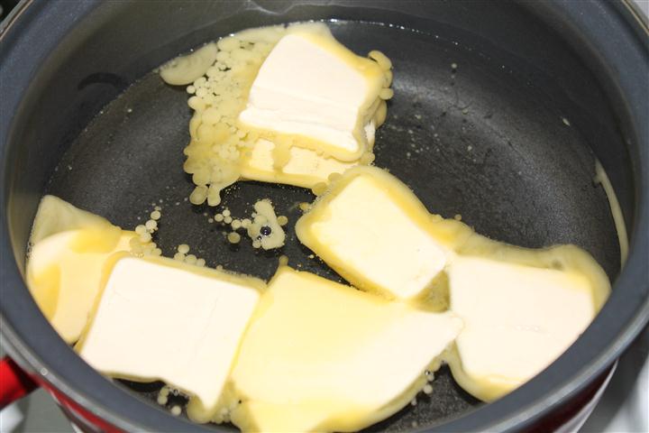 Se pune la incalzit intr-o oala apa impreuna cu margarina.