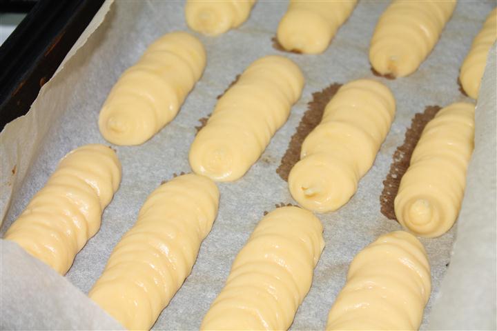Se pregateste o tava cu hartie de copt. Cu ajutorului un pos (poche) de bucatarie realizati forme de ecler de 5-7 cm lungime. Daca nu aveti pos, umpeti o punga normala de plastic cu aluat, o taiati la un capat si stoarceti pe acolo aluatul, simplu nu :).