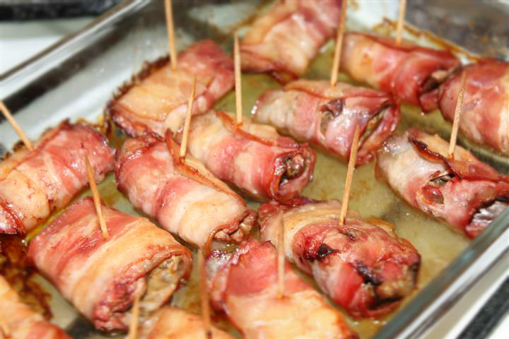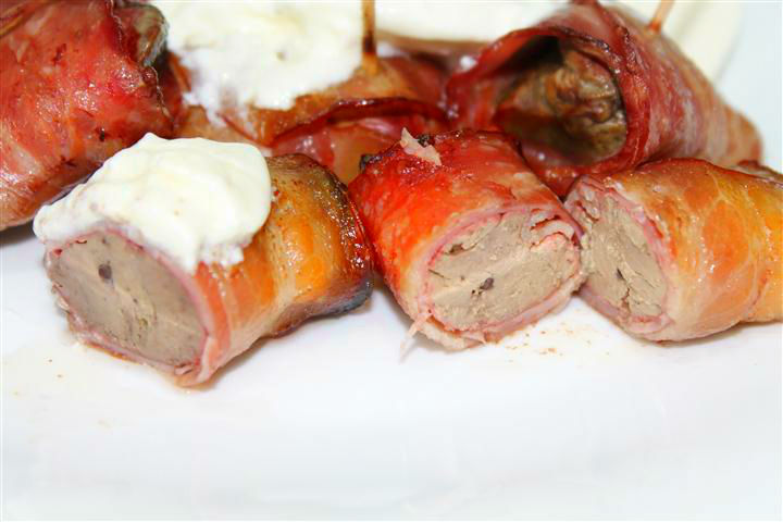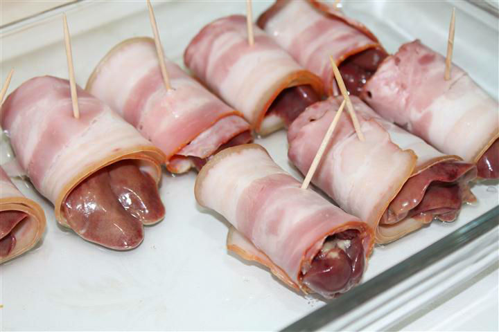 Se sareaza si se pipereaza putin. Se imbracata ficatei in bacon si se inteapa cu o scobitoare
