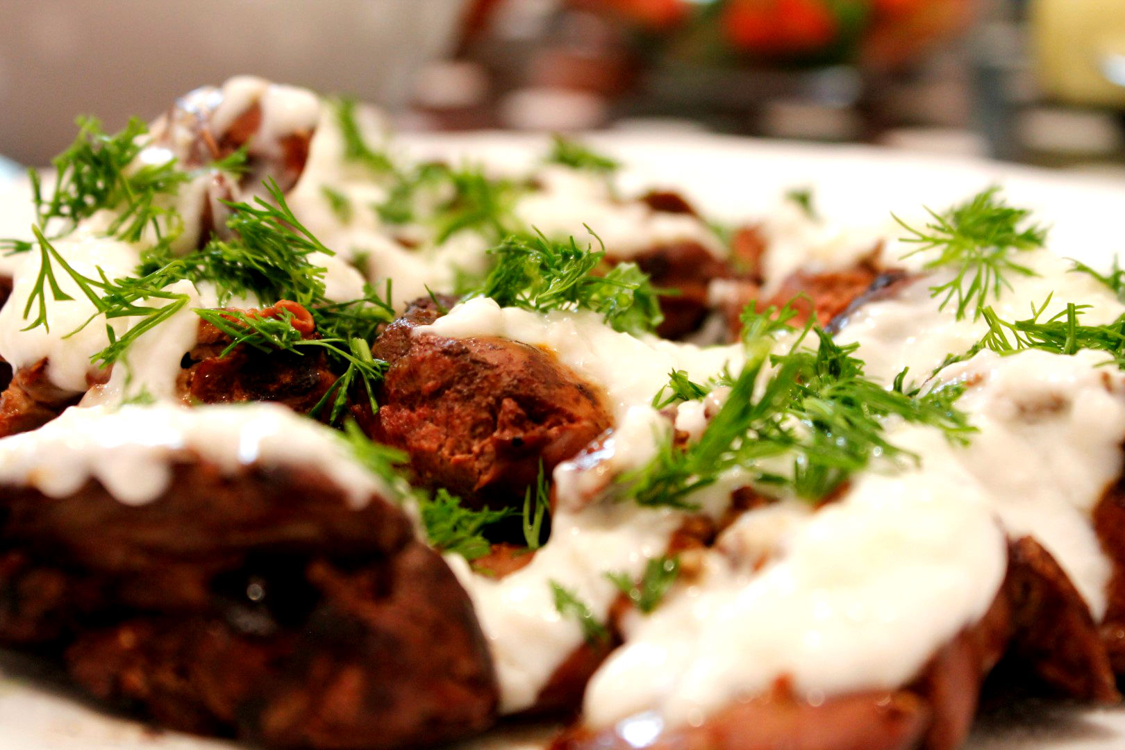 III. Se condimenteaza usor cu sare si piper proaspat macinat. Intre timp se realizeaza mujdeiul din usturoi cu smantana sau iaurt si putina sare.