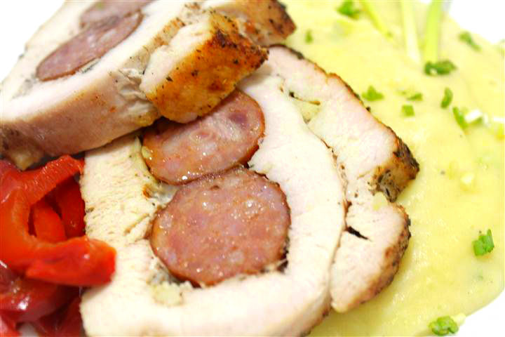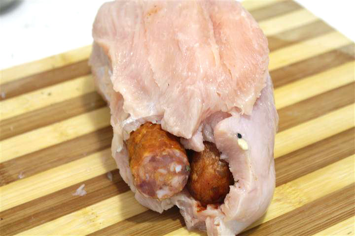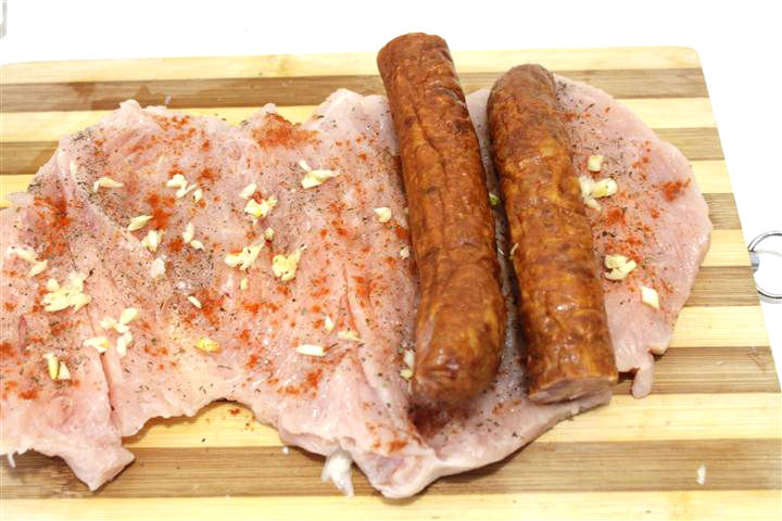 Carnatul de porc sa taie in doua si se inveleste cu pieptul de curcan.