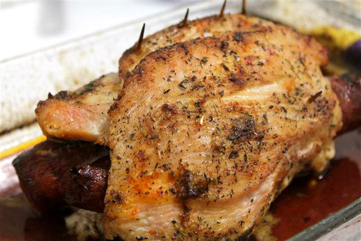 Aroma din carnatul de porc a intrat si in friptura de curcan, iar combinatia dintre o carne grasa si una slaba este nemaipomenita. Cred ca aceeasi combinatie merge si cu piept de pui fara probleme. Condimentarea pieptului de curcan cade in sarcina Dvs, depinde cat de mult va plac condimentele, puteti sa renunatati la unele sau sa le inclocuiti cu coriandru sau salvie, insa usturoiul trebuie sa fie prezent.