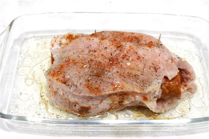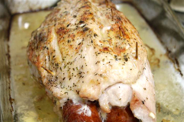 Condimentati si pe afara pieptul de curcan la fel ca si pe interior insa fara usturoi. Stropiti un vas de yena / tava cu ulei si puneti pieptul de curcan. Adaugati putin ulei de masline si pe deasupra pieptului de curcan. Adaugati 100 ml de vin, 100 ml de apa si dati la cuptorul incalzit la 180 de grade pentru aprox 30 de min.