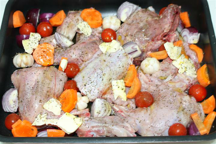 Ma uit prin frigider, gasesc ceva rosii cherry si niste morcovi, ceapa, usturoi si unt am tot timpul, pe usa frigiderului la bauturi vad o sticla de vin alb perfect pentru friptura de iepure la cuptor. Am servit-o simpla cu legumele din tava si usturoiul copt pe deasupra alaturi de un pahar de vin alb ;).