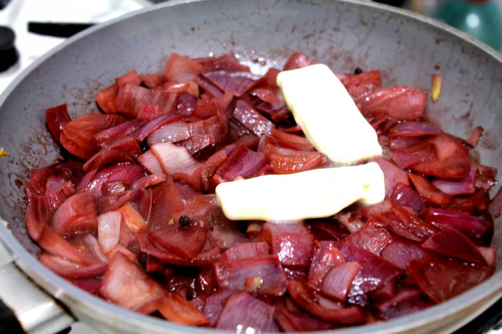 Condimentati cu o lingurita de sare si o lingurita de zahar si lasati sa scada vinul usor. Cand aprope vinul s-a evaporat, adaugati unutul, lasati sa se topeasca, adaugati restul de vin si mai tineti pe foc 2-3 minute.