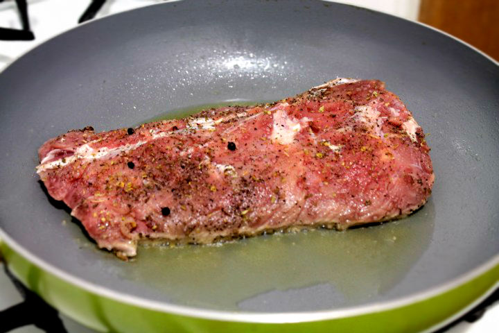 Carnea trebuie spalata bine inainte si curatata de pielite sau grasime. Pe un fund de lemn presarat sare, piper macinat si piper boabe, cimbru si oregano.