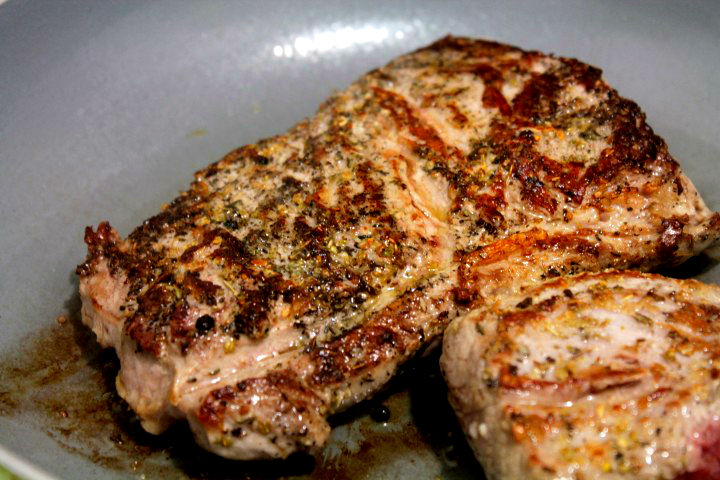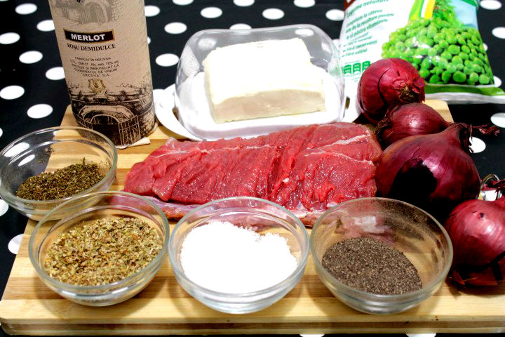 Tavaliti carnea de vita pe toate partile prin aceste condimente. Intr-o tigaie incingeti ulei de masline si prajiti carnea pe toate partile pana prinde o crusta frumoasa.