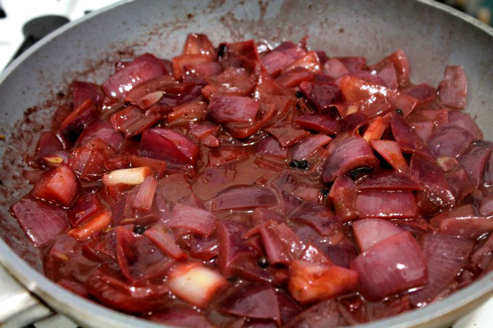 Dupa ce devine lucioasa se adauga 150 de ml de vin si se reduce focul.
