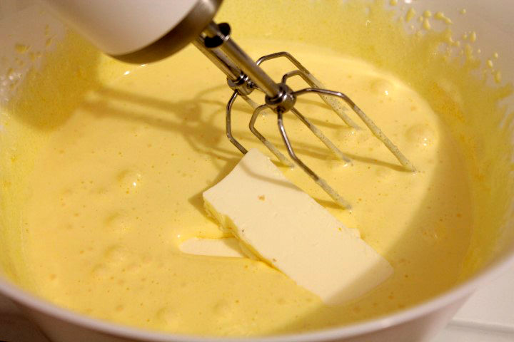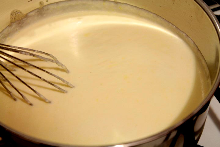 Se aduga usor lapte caldut in galbenusuri apoi se pun pe foc si se amesteca pana cand se formeaza o crema usoara.