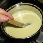 - Dupa ce ai turnat tot laptele, pune compozitia obtinuta inapoi in cratita si gateste, amestecand continuu, pana ce crema se ingroasa destul cat sa acopere spatele lingurii de lemn. Nu o lasa sa fiarba caci altfel se va taia.