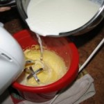 - Pune esenta de vanilie in laptele cu frisca ce au fiert.