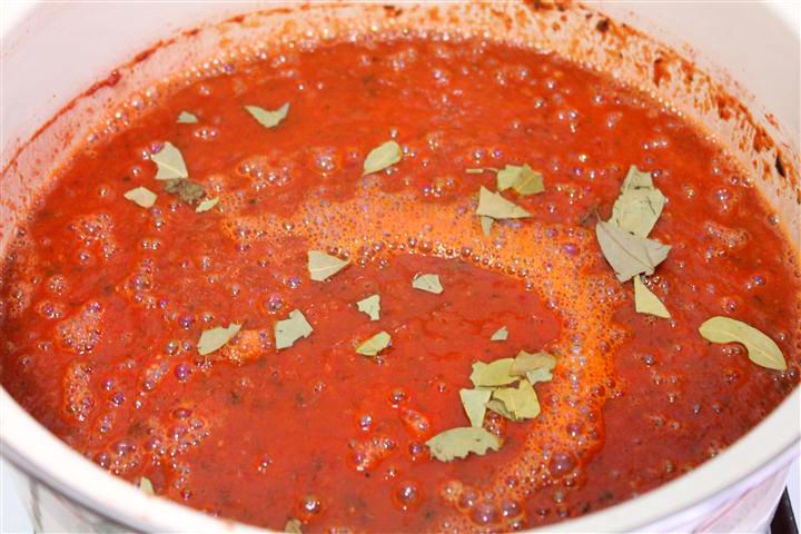 In oala in care este sucul de rosii se adauga ceapa calita, ardeiul copt si toate ingredientele de mai sus mai putin foile de dafin. Usturoiul se adauga pisat, sau spart cu lama cutitului si taiata subtire.