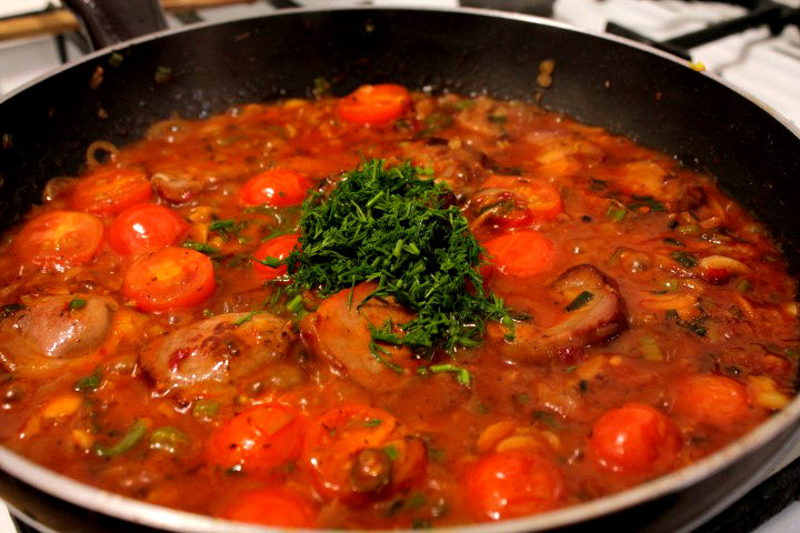 Se adauga pasta de ardei, pasta de tomate, rosiile cherry taiate in doua si o canuta de apa.Ā Se lasa pe foc cam 10 minute timp in care se amesteca usor cu o lingura de lemn.