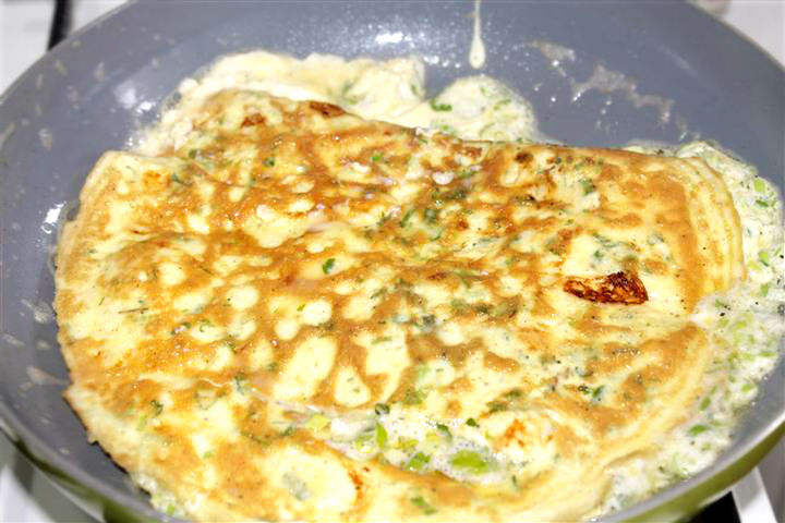 Chiar daca nu aveti ceapa verde mege si cu ceapa alba sau rosie mare, sau eventual cu ceapa de apa. Puteti sa adaugati si feliute subtiri de sunca, sau salama, rondele de ardei, tocmaai aceste este avnatajul omletei, faptul ca poti sa pui tot ce vrei in ea. Daca preparati aluatul de seara, puneti o folie de aluminiu sau transparenta(strech) peste castron.