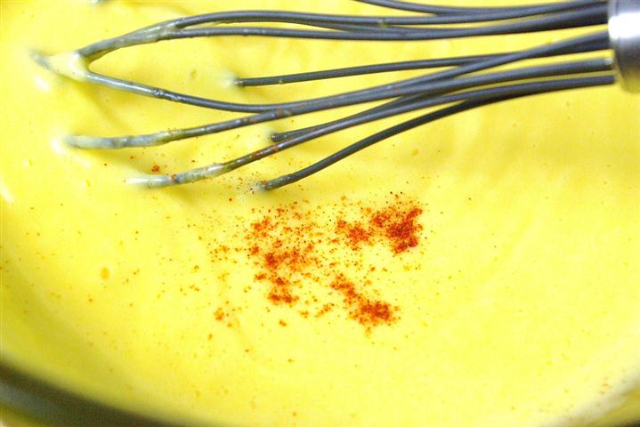 V. Dupa ce s-a legat bine sosul, il luati de foc (bain-marie) adaugati zeama de lamaie si condimentati cu sare, piper si boaia. Amestcati bine sa se intrepatrunda aromele, puti o folie strech deasupra si dati deoparte.