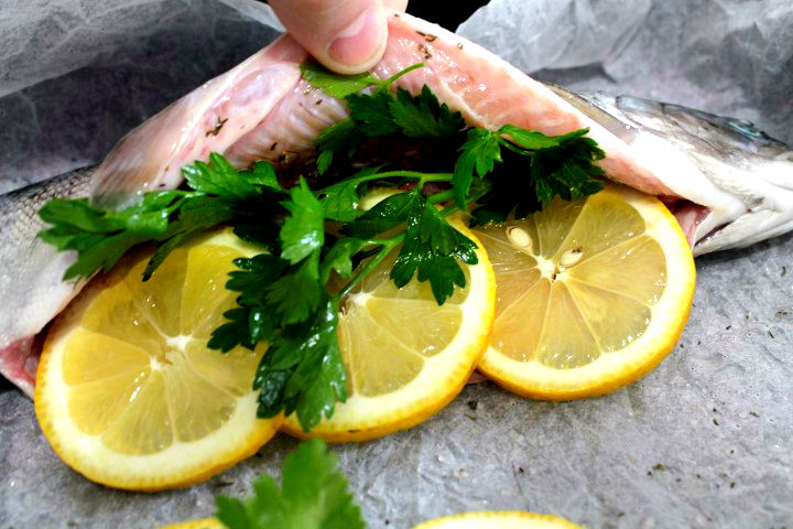 - Se aseaza pastravul in tava si burta acestuia se umple cu felii de lamaie si un manunchi de patrunjel.