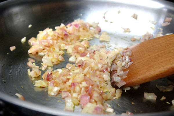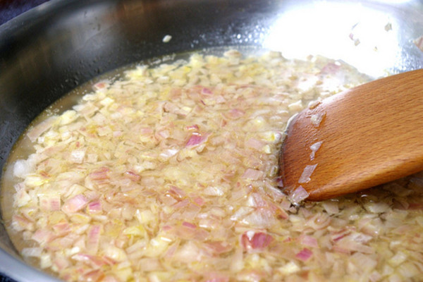 Caliti ceapa pana se inmoaie, aprox 5-7 min pana se evapora vinul si ramane ceapa caramelizata.Se trage tigaia de pe foc si se adauga cubuletele de unt.