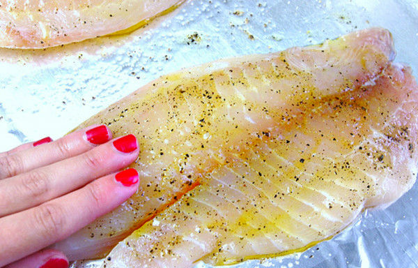 Fileurile de peste tilapia se condimenteaza bine pe ambele parti cu sare, piper, ulei de masline